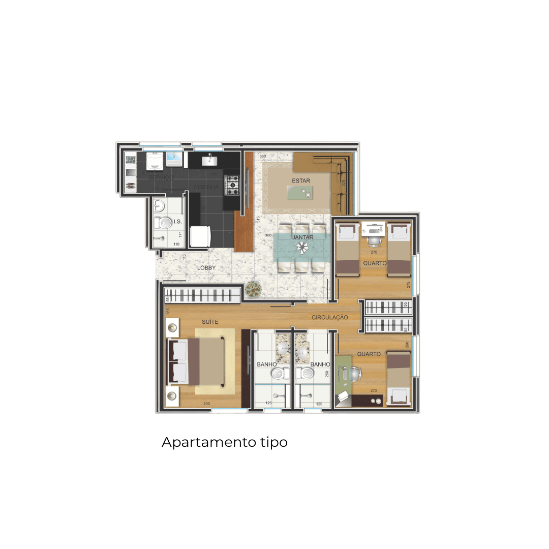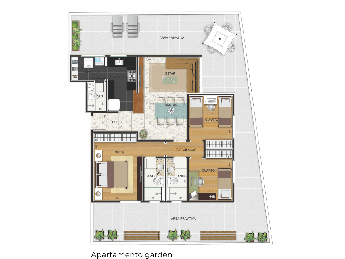 As unidades do Duo Patio são divididas em plantas de 3 quartos, com metragens de 82 metros quadrados.